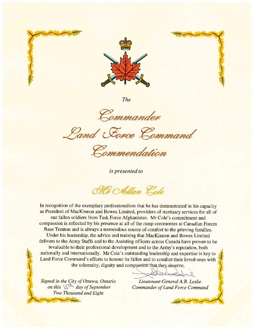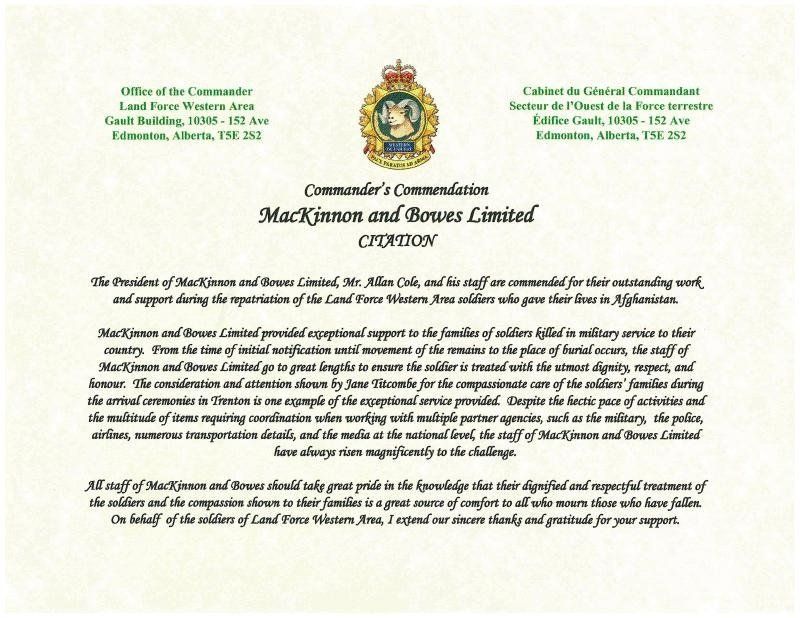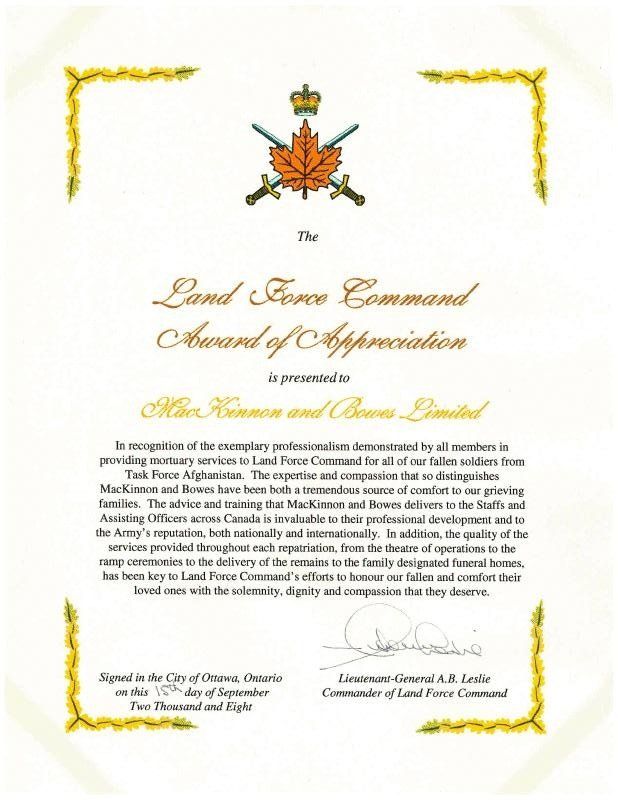 Presented by Lieutenant-General Andrew Leslie in 2008. Presented to MacKinnon & Bowes Limited "in recognition of the exemplary professionalism demonstrated by all members of MacKinnon & Bowes in providing mortuary services to Land Force Command for all our fallen soldiers from Task Force Afghanistan. The expertise and compassion that so distinguishes MacKinnon & Bowes have been both a tremendous source of comfort to our grieving families".