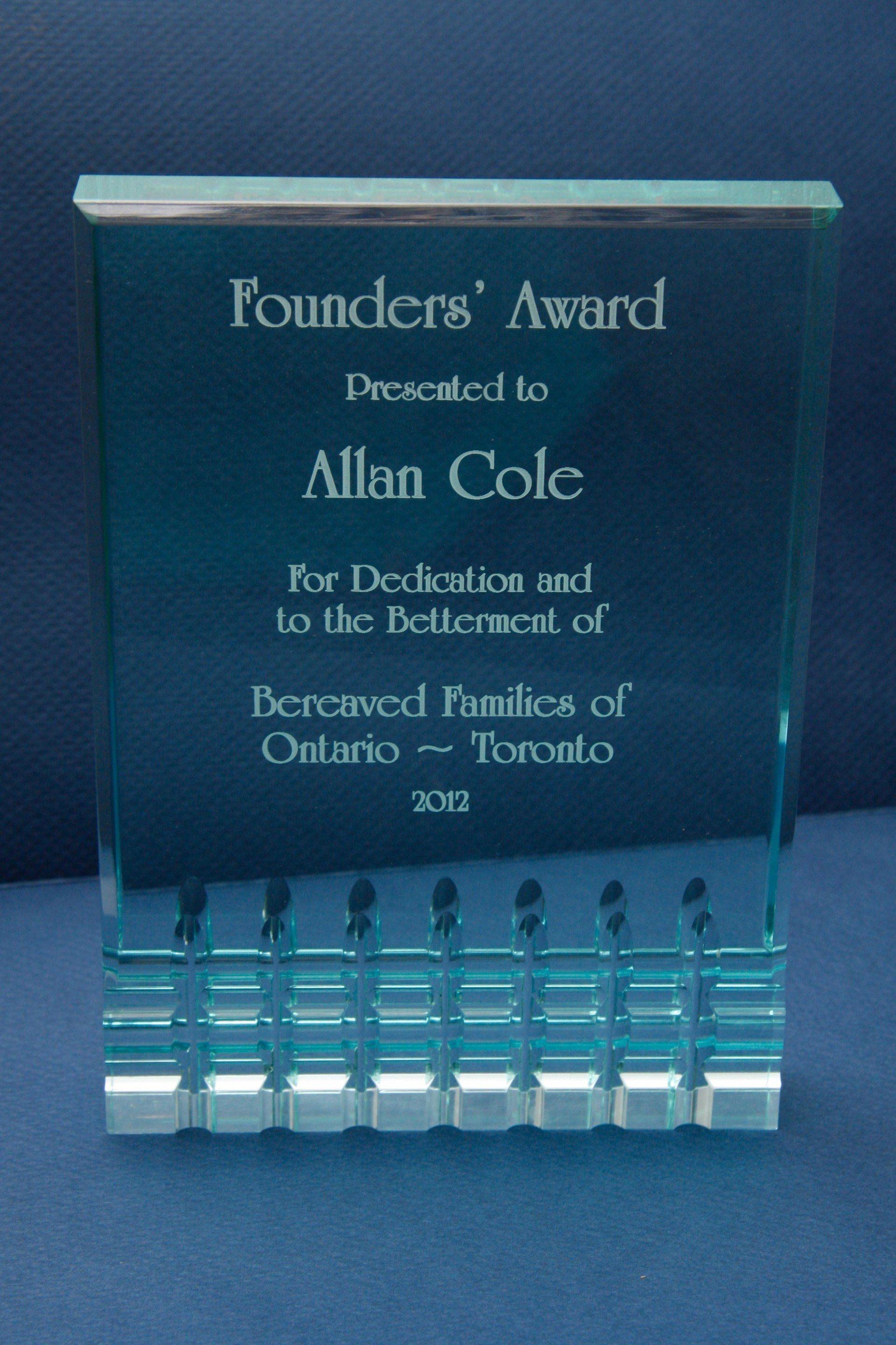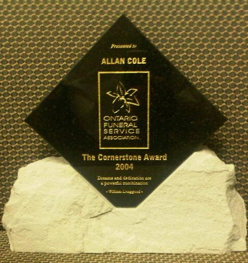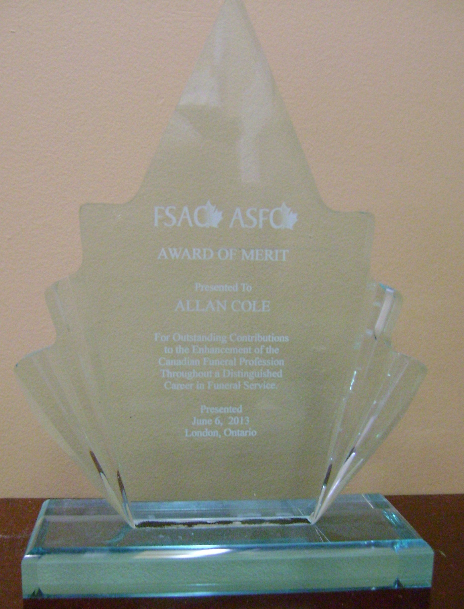Presented to Allan Cole for Outstanding Contributions for the Enhancement of the Canadian Funeral Profession Throughout a Distinguished Career in Funeral Service, Presented June 6, 2013 at London, Ontario, Canada. This special honour is awarded annually to a member of the Funeral Service Association of Canada for contributions made by an individual over the span of their career. This is the highest honour and recognition that can be bestowed upon someone in Funeral Service in Canada each year.
