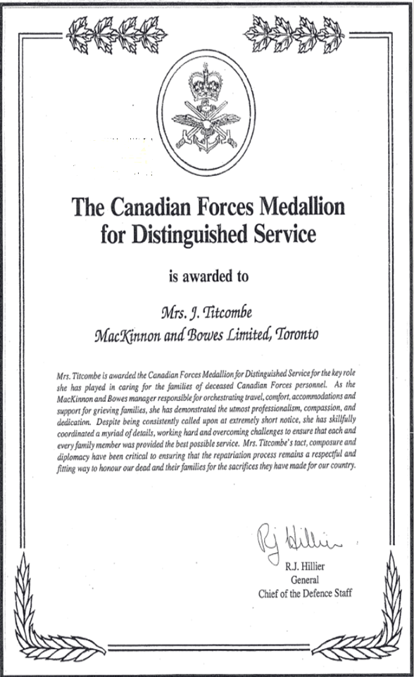 Presented in 2007 to Jane Titcombe - Canada's Chief of the Defense Staff - General Rick Hillier. "As the MacKinnon & Bowes manager responsible for orchestrating travel, comfort, accommodations and support for grieving families, she has demonstrated the utmost professionalism, compassion, and dedication". This is the highest honour that can be bestowed upon a Civilian by the Canadian Military and is a special recognition reserved for very special circumstances.
