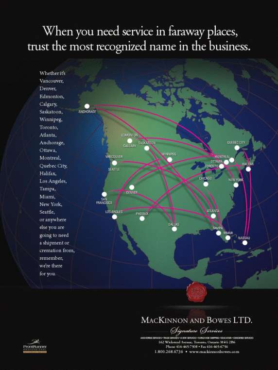 MacKinnon & Bowes leads the way in Canada by providing shipments and cremations from every major urban center in North America. Over the years we have established a network of excellent service providers throughout Canada and the United States. Whether your requirements are in Toronto or Edmonton, or Calgary, or Vancouver or Miami, you can count on the MacKinnon & Bowes fair pricing model and attention to detail to represent your firm. Our service providers are known for their quality workmanship and excellent standards of practice. Funeral homes throughout Canada rely on MacKinnon & Bowes whenever they have a call outside their regular calling area. Don't just choose a name of a service provider far away from a trade publication, entrust your call to the people you know and trust at MacKinnon & Bowes. Fair pricing and our Signature Service guarantee give your the peace of mind you need with a call far away. Prices provided upon request.